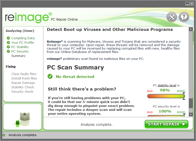 The PC used for testing ReImage was freshly reinstalled. On particular PC, it found one problem only : that Microsoft Installer crashed sometimes. All other scans came out clean. I can accept as having no false positives. Funnily enough, the PC used for testing was infected, but its Virus scan came out clean as well (it had Security Tool infection, for testing purposes). So its virus scan is not the best.